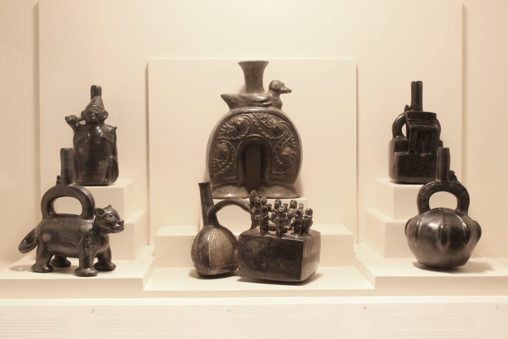Die Chimú-Elite entscheidet sich für schwarze Keramik und lehnt Einflüsse aus dem Süden – wie die Vielfarbigkeit oder die durch den Steg verbundenen zwei Schnäbel der Gefäße – ab.